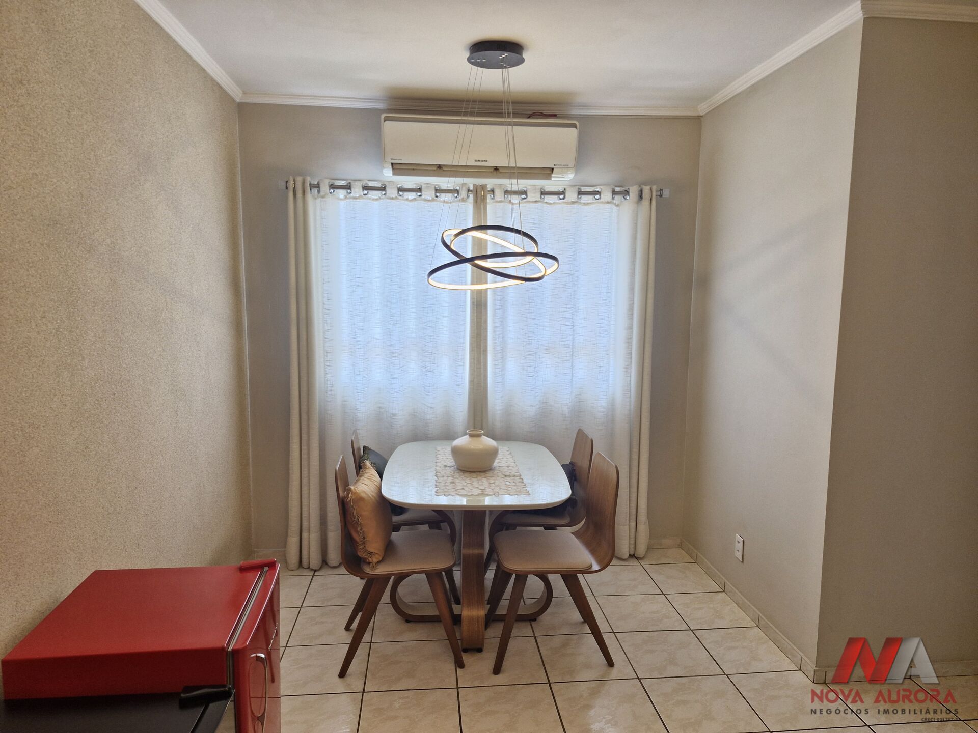 A sala é ampla, com espaço para dois ambientes, estar e jantar, integrando conforto e versatilidade ao dia a dia. A cozinha dispõe de armários planejados e é integrada à lavanderia, garantindo organização e praticidade.