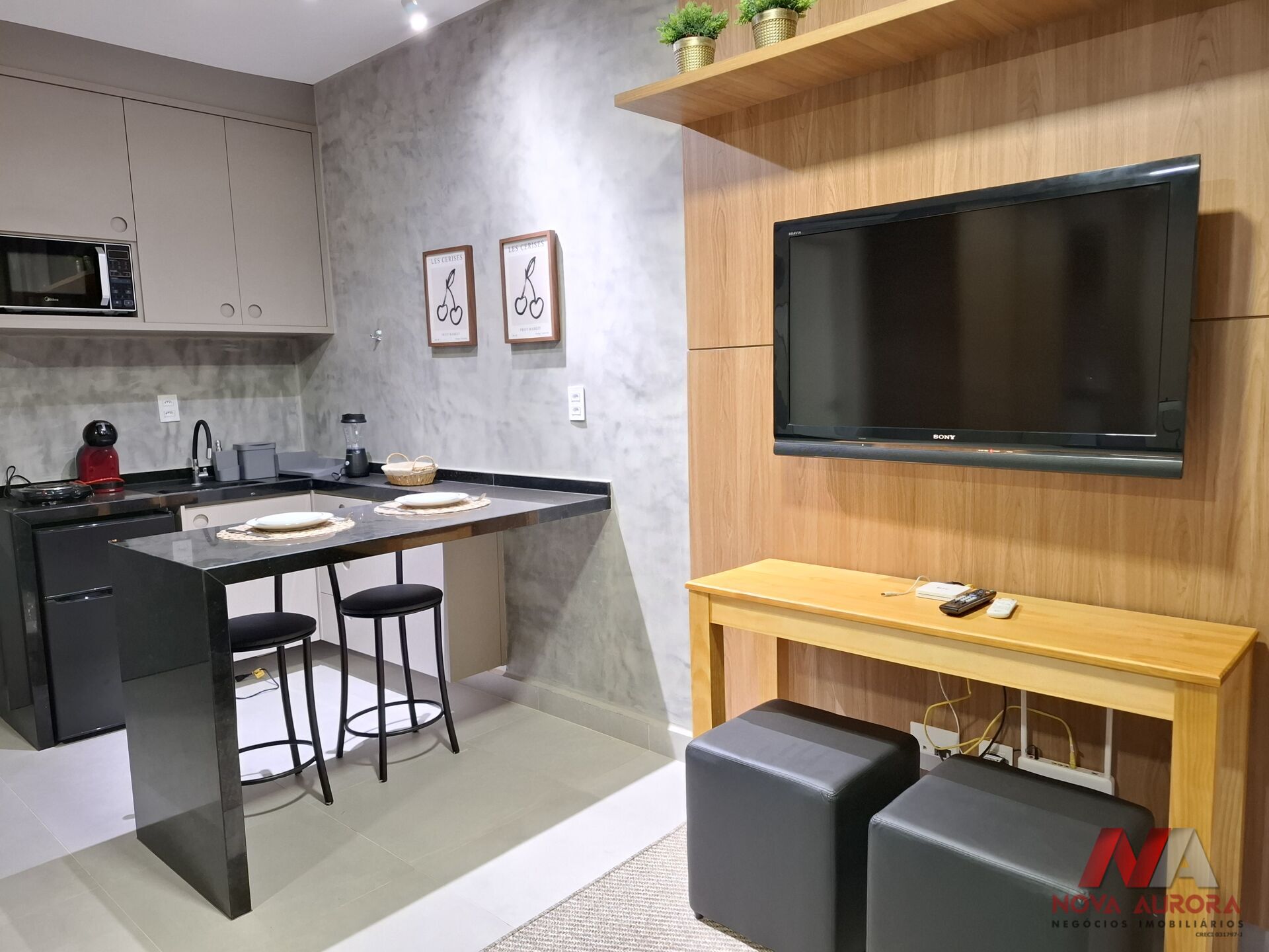 O imóvel conta com 01 dormitório integrado à sala, equipado com cama, armários planejados e ar-condicionado, proporcionando um ambiente funcional e bem aproveitado. A sala dispõe de sofá, painel de TV e televisão, integrada de forma harmoniosa ao dormitório, além de acesso à sacada, que valoriza a iluminação e a ventilação natural.