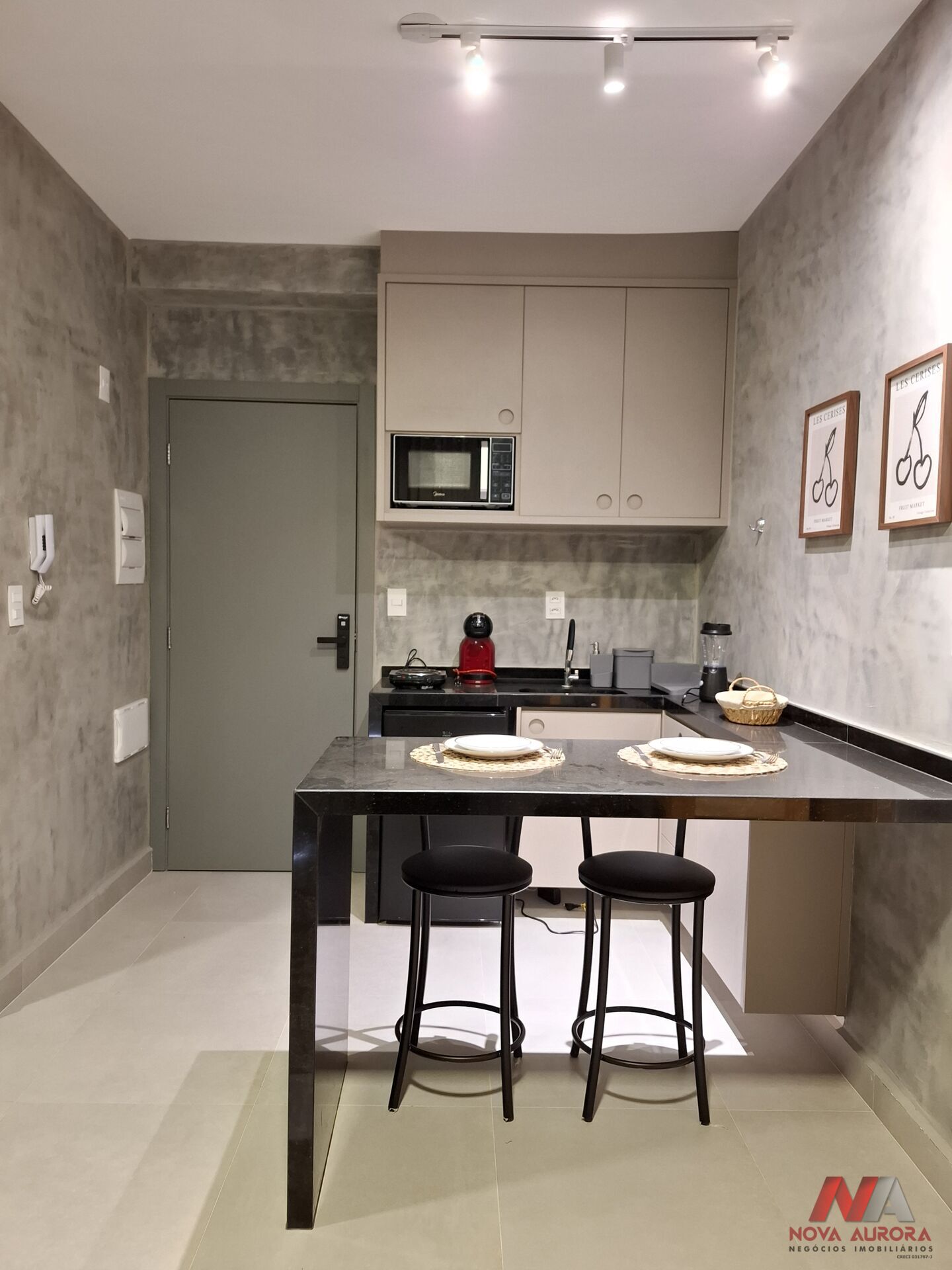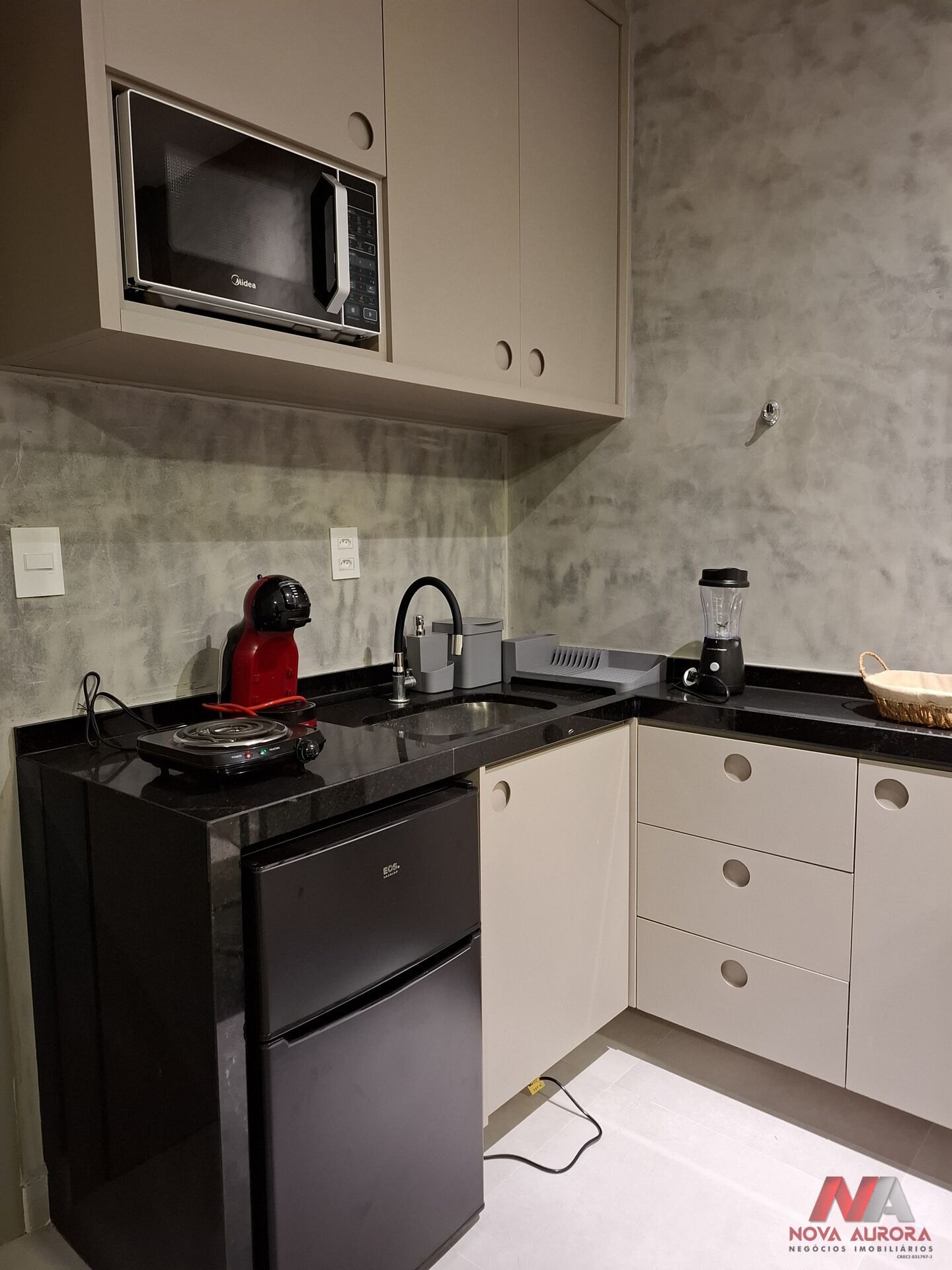 A cozinha é planejada e equipada com frigobar, fogão de indução, cafeteira, micro-ondas e dois bancos, oferecendo praticidade para o dia a dia. O banheiro possui armários, espelho e box em blindex, com excelente acabamento.