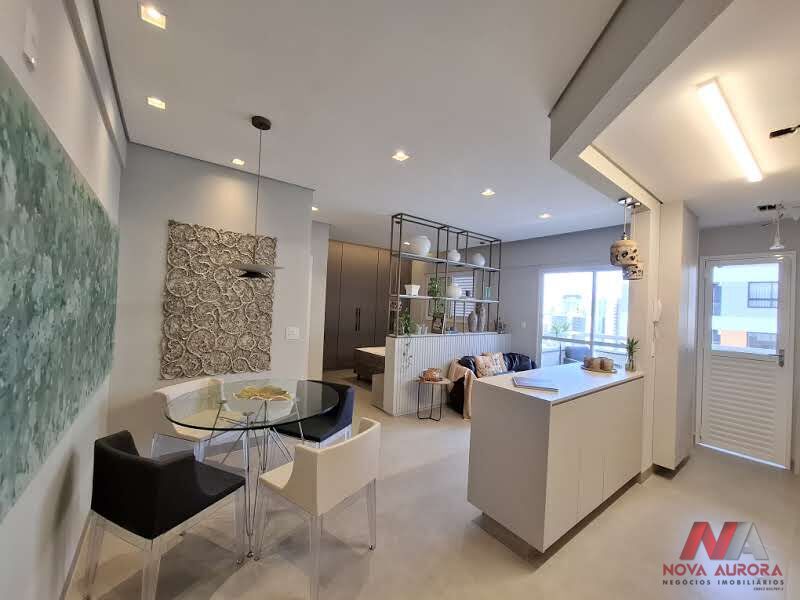 O imóvel conta com sala para dois ambientes, equipada com sofá e jogo de mesa com cadeiras, proporcionando conforto e praticidade no dia a dia. A cozinha é estilo americana, totalmente planejada, com geladeira, forno, cooktop, exaustor e micro-ondas, integrada à lavanderia, que também possui armários planejados, otimizando o espaço.