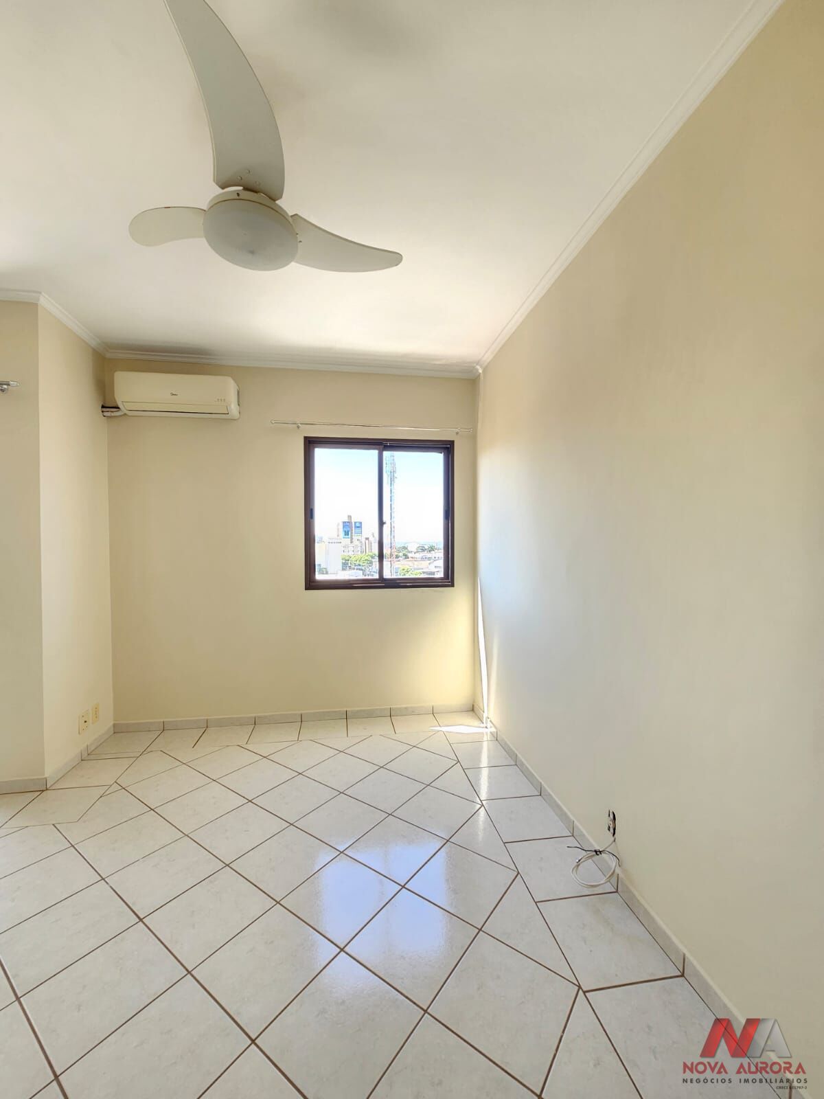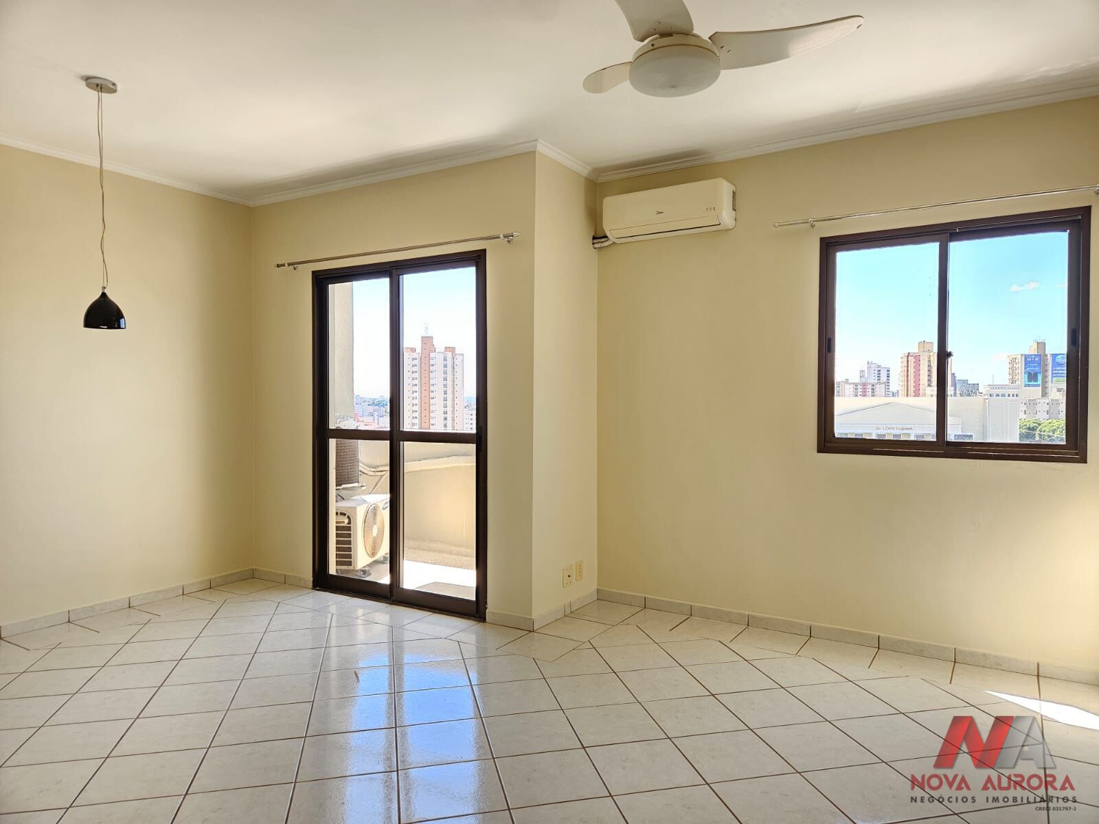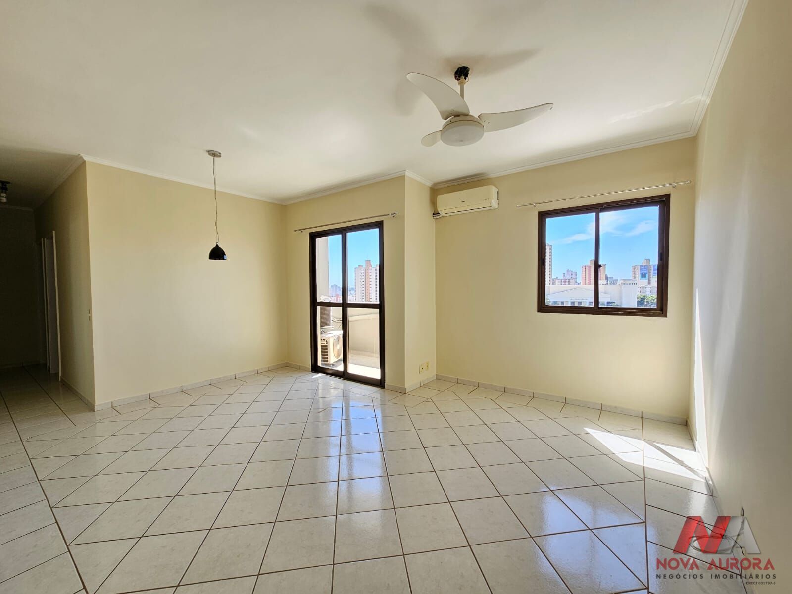 O imóvel dispõe de uma sala ampla para dois ambientes, estar e jantar, proporcionando conforto e boa distribuição dos espaços. A sala conta com ar-condicionado e ventilador, além de acesso à sacada com vista externa, garantindo boa iluminação natural e ventilação.