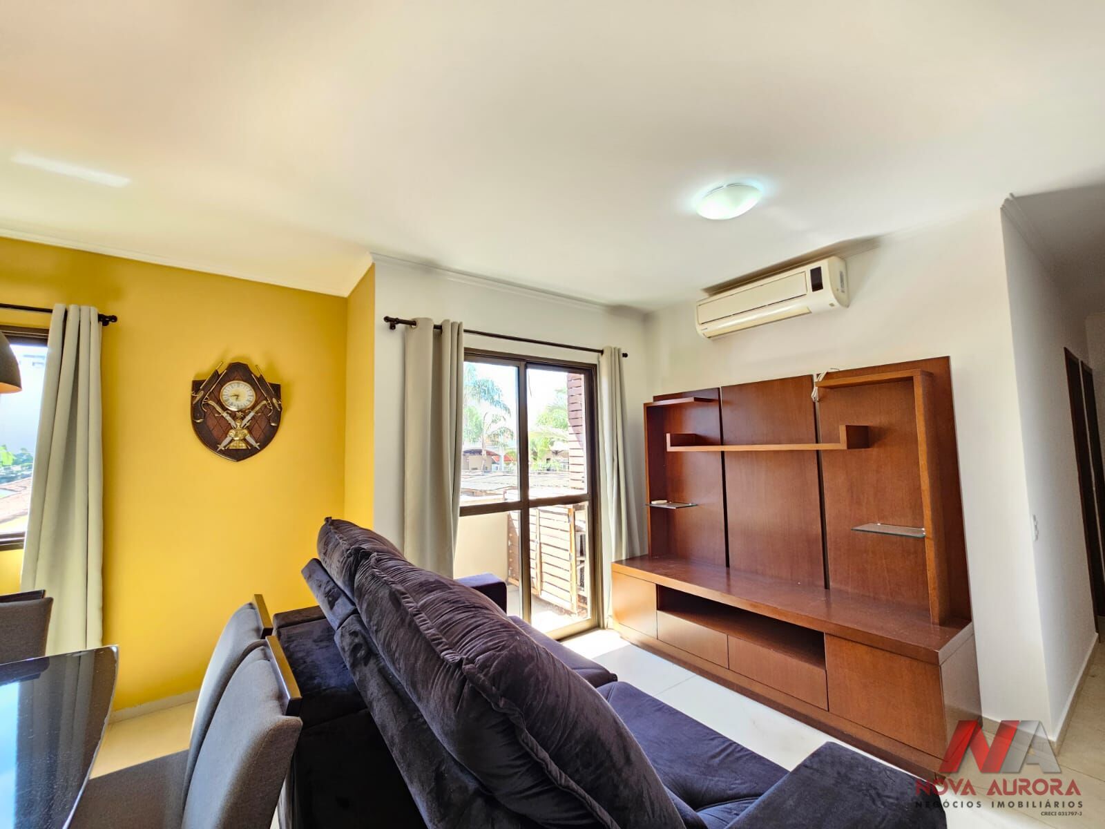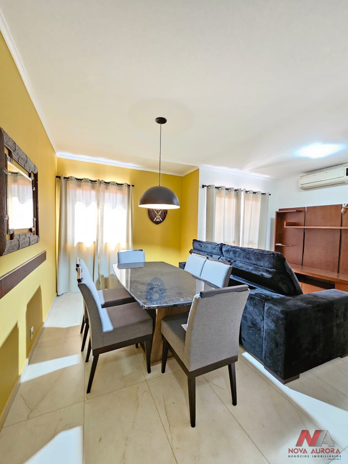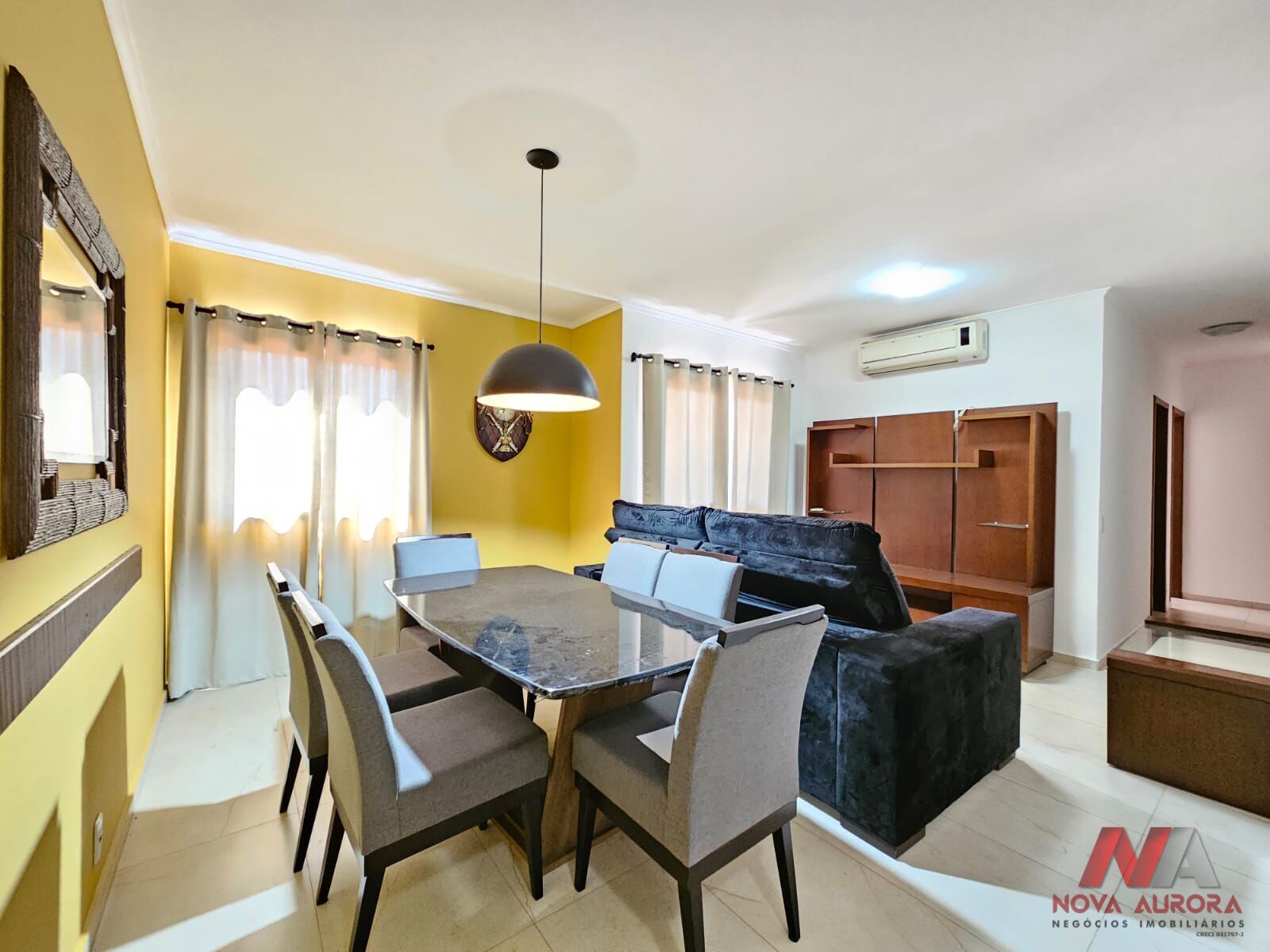 O imóvel conta com sala ampla para dois ambientes, estar e jantar, equipada com ar-condicionado, sofá, rack com painel e mesa com cadeiras, proporcionando um ambiente confortável e funcional.
