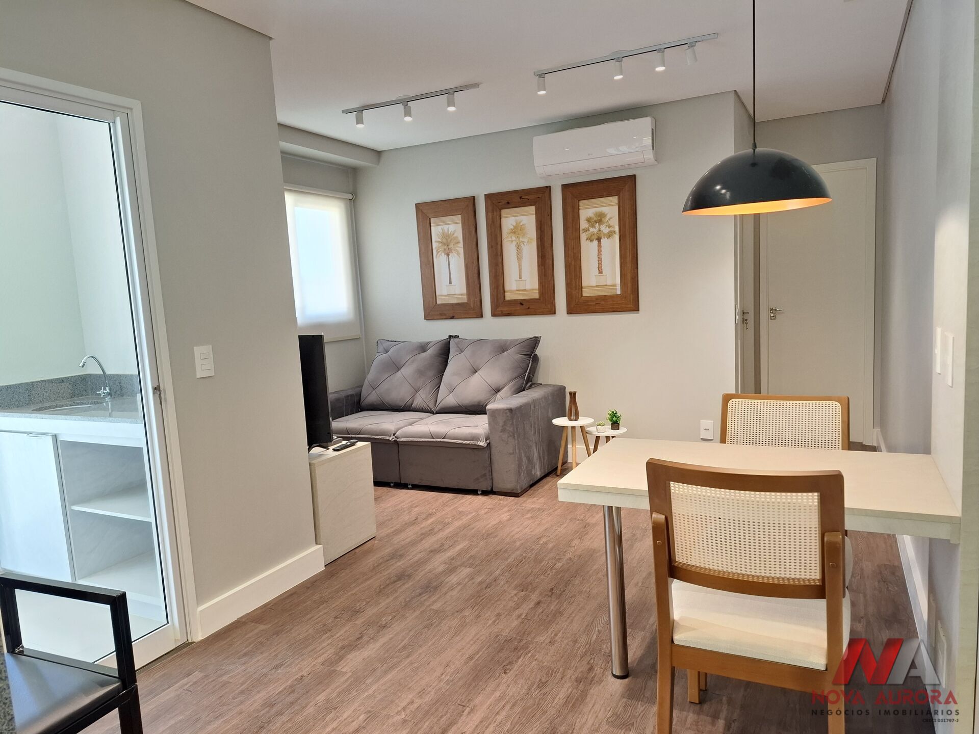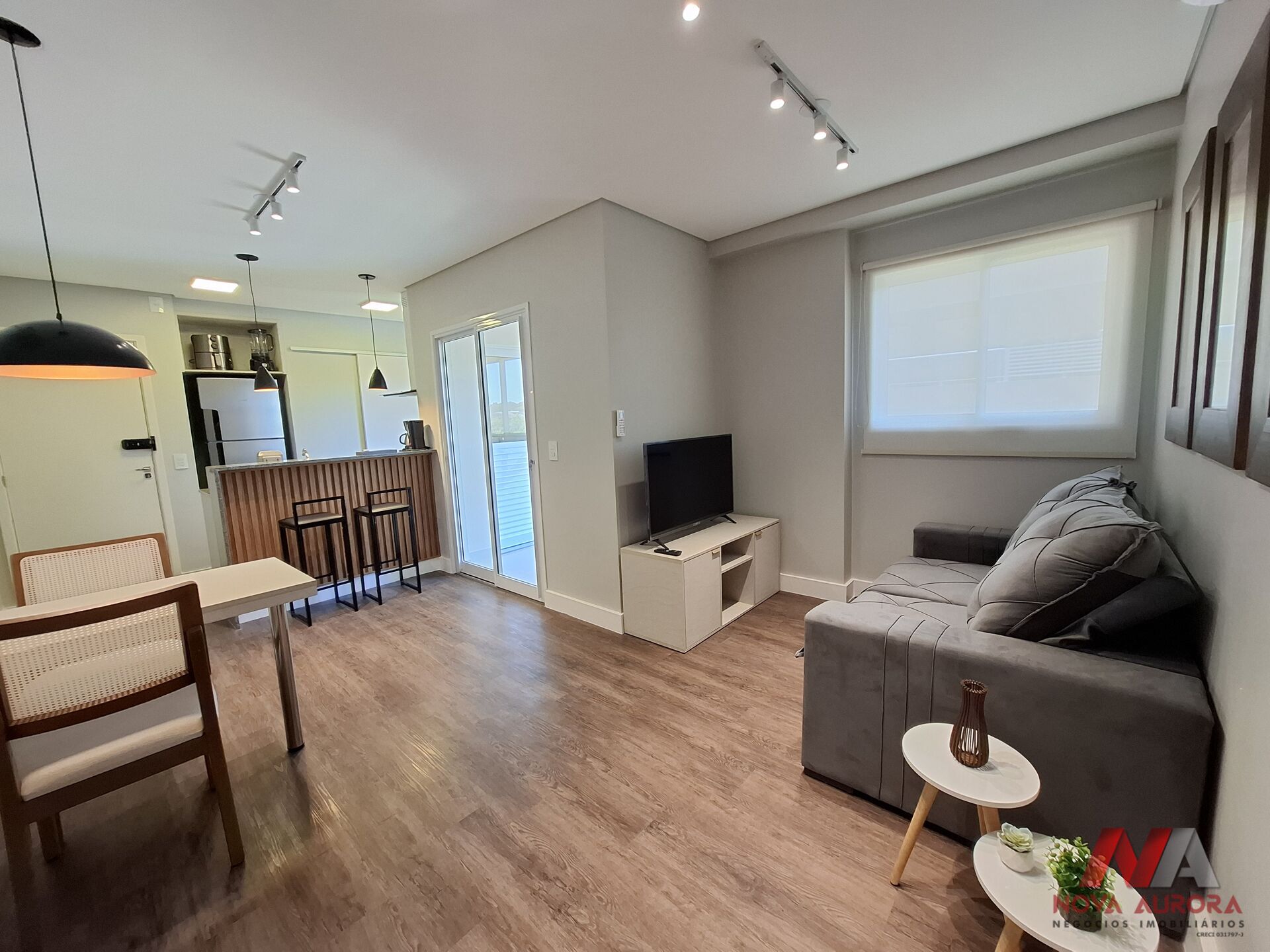 O imóvel dispõe de sala para dois ambientes, estar e jantar, equipada com sofá, conjunto de mesa com 02 cadeiras, duas banquetas, balcão americano e ar-condicionado, proporcionando um ambiente funcional e aconchegante com acesso a sacada estendida que conta com pia. A cozinha, em estilo americano, conta com armários planejados, geladeira, fogão de indução, micro-ondas e air fryer, integrada à lavanderia, que também possui armários.