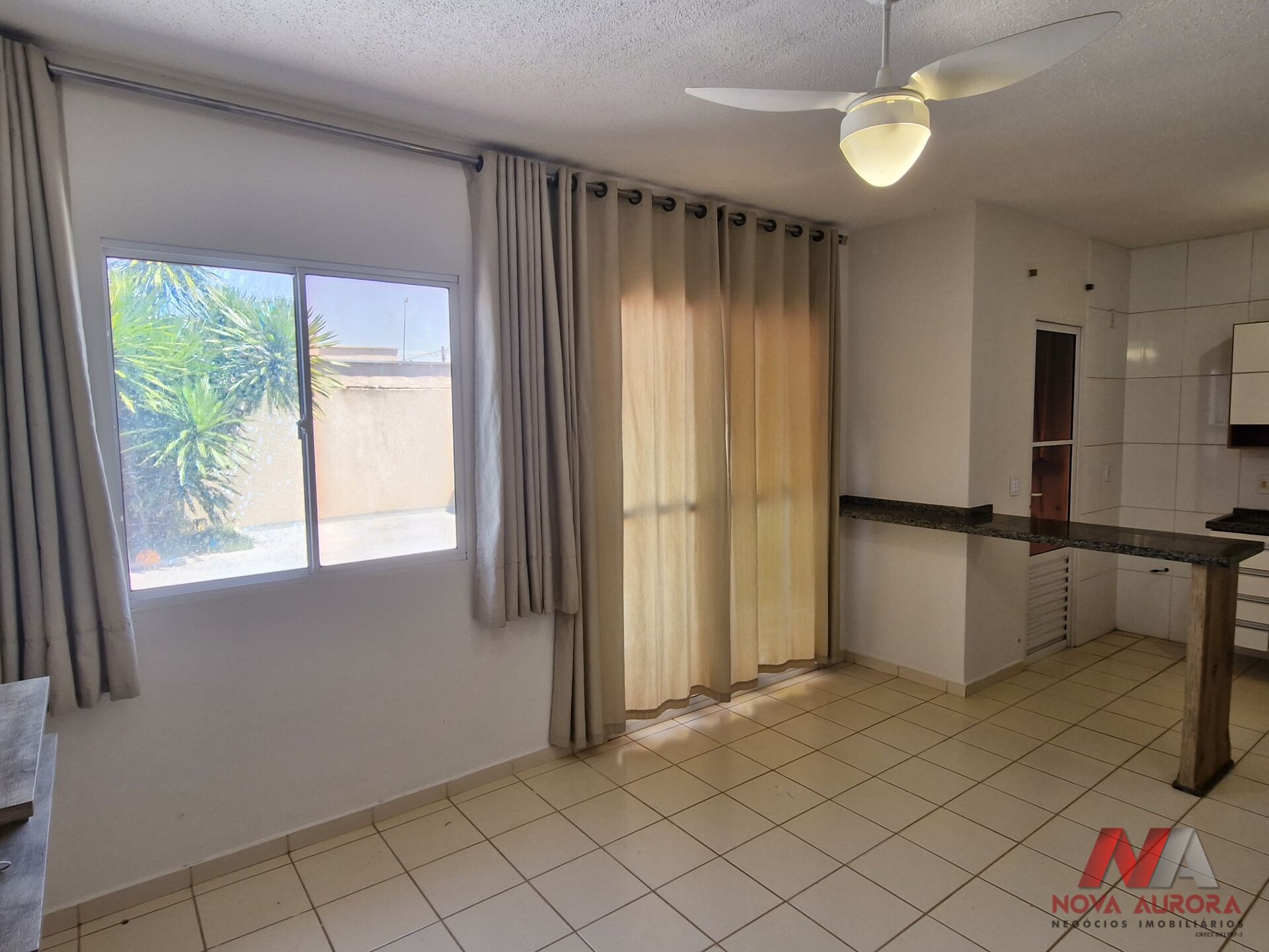 O imóvel conta com sala para dois ambientes, equipada com ar-condicionado e painel de TV, proporcionando um espaço aconchegante para estar e jantar. A cozinha é no estilo americana e possui armários planejados, oferecendo funcionalidade no dia a dia.